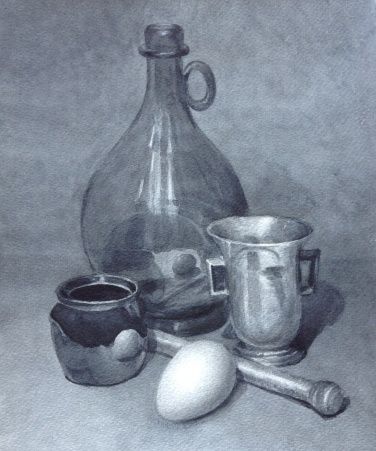 Тон в живописи: Гризайль. Натюрморт с натуры на материальность - керамика, стекло, металл. Передача фактуры, и формы предметов