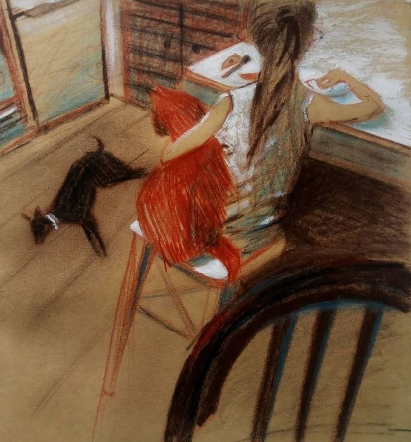 Работы выполнены в смешанной технике, каждая работа рисовалась тем материалом, который больше подходил по фактуре и настроению. Здесь и масляная, и сухая пастель, и акрил, и гуашь, тушь, темпера, цветные карандаши.